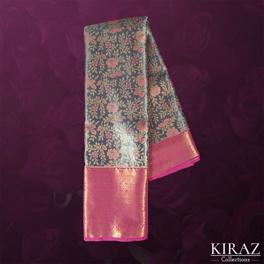 The saree is adorned with delicate floral motifs, creating a mesmerizing pattern that glimmers under the light...